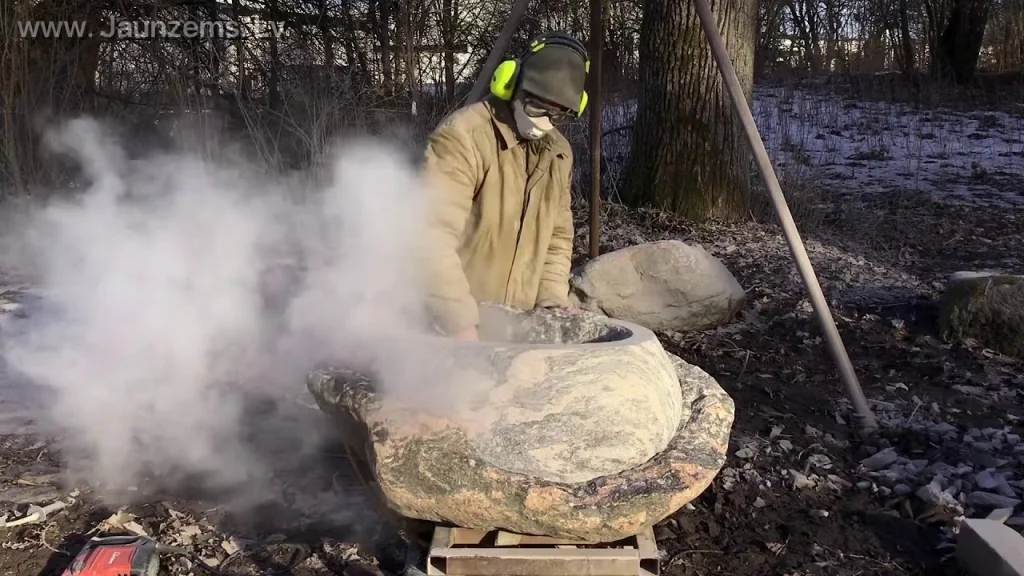 Dabīgi krāsainā laukakmenī, jeb kā mēdz dēvēt, dekoratīvā akmenī kalts un veidots puķupods, dēstu trauks, vāze. Autors tēlnieks Ronalds Jaunzems www.jaunzems.lv